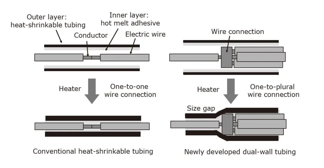 我们开发了可用于保护一对多的汽车线束连接的双壁管。当加热到相对较低的温度(135°C)时,新管符合导线连接的不规则外形。另外,该管不会引起粘合剂的流出或引起位置偏移,并且在125℃的使用环境下表现出高机械特性。由于其优异的热收缩性和密封性能,新管材有望在汽车领域得到广泛应用。
