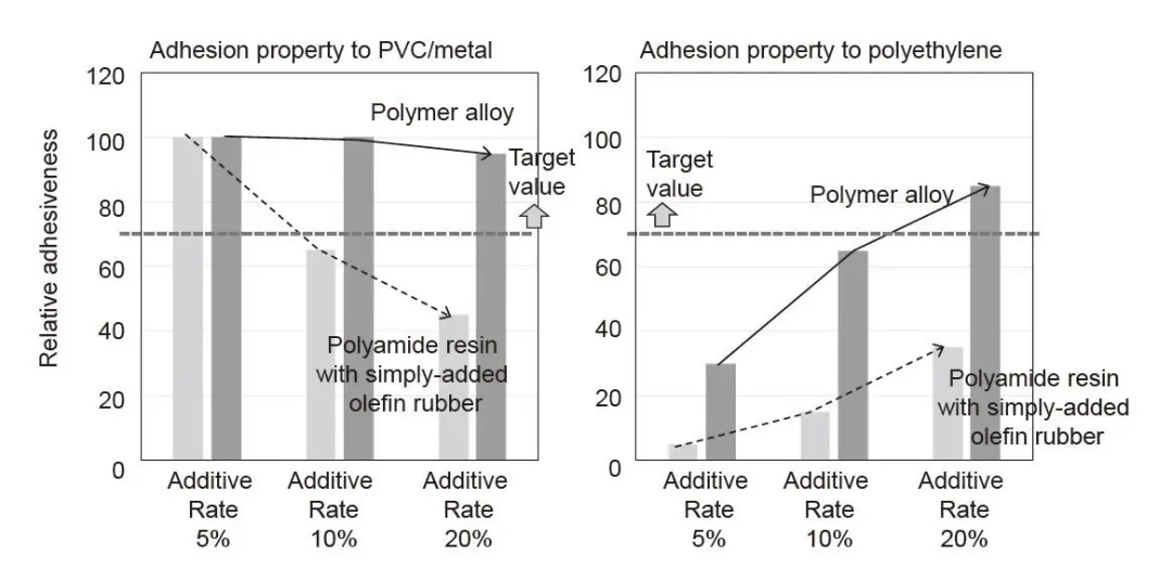 图9.聚酰胺树脂与简单添加的烯烃橡胶和聚合物合金之间的粘合力差异