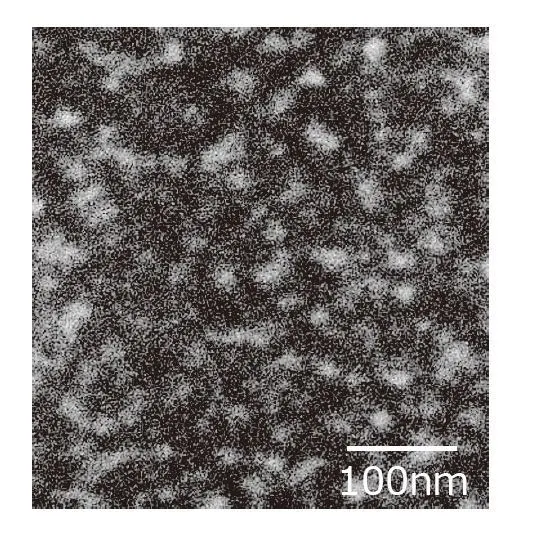 随后,我们测试了通过向聚酰胺树脂中添加少量烯烃橡胶制成的聚合物合金(图9)。在该测试中,该聚合物为聚酰胺树脂提供了对聚乙烯的高附着力,同时保持了聚酰亚胺树脂对PVC和金属的高附着力。相结构的透射电子显微镜的结果(图10)表明,烯烃橡胶以纳米级细分散。我们得出的结论是,聚酰胺树脂和烯烃橡胶之间的界面强度增加以及应力集中阻力的增加导致聚合物合金粘合性的增加。