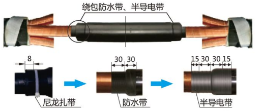 2)接头绝缘主体两端,从外半导电层上开始,搭接约30mm半搭接绕包3层防水带至接头绝缘主体上并搭接30mm。