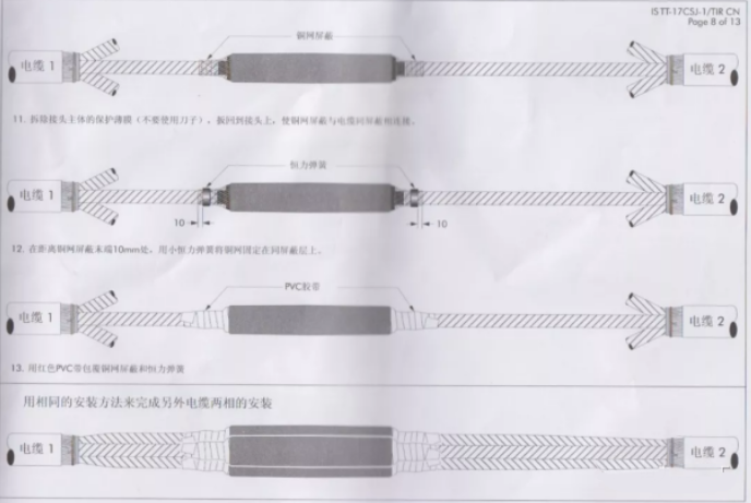 9797cc彩票 接头两端防水处理:在距接头绝缘主体两端约8mm位置分别用尼龙扎带扎紧(注意:确保扎紧牢靠,且尼龙扎带与接头绝缘主体贴合紧密、无间隙)。同时仅保留露出约2mm的尼龙扎带,其余去除。然后去掉铜屏蔽层上的PVC胶带及记号。清洁接头绝缘主体两端及电缆外半导电层,从电缆外半导电层上开始,搭接约30mm半搭接绕包3层防水带至接头绝缘主体上并搭接301;在防水带上绕包一层半导电带,分别盖过铜屏蔽和接头绝缘主体约15mm,见图(8)。按此工艺处理其他两相。