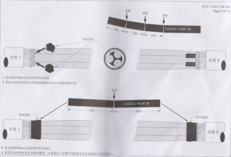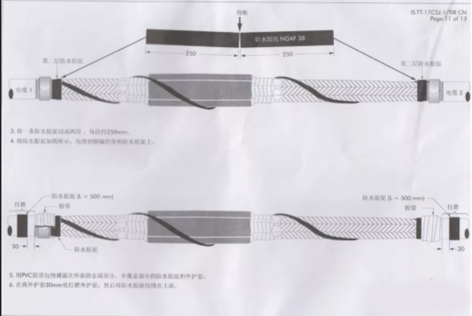9797cc彩票 4)外护套防水处理(第二层):两端铠装打毛,将防水带拉长至约1.5倍以半搭叠方式从一端电缆外护套开始绕包至另一端电缆外护套上,要求与外护套搭接100mm。