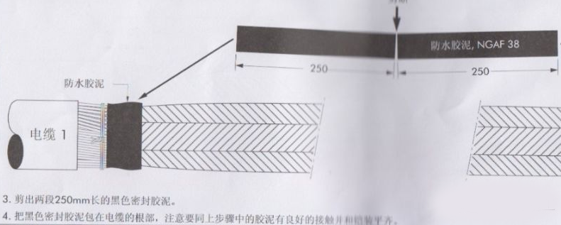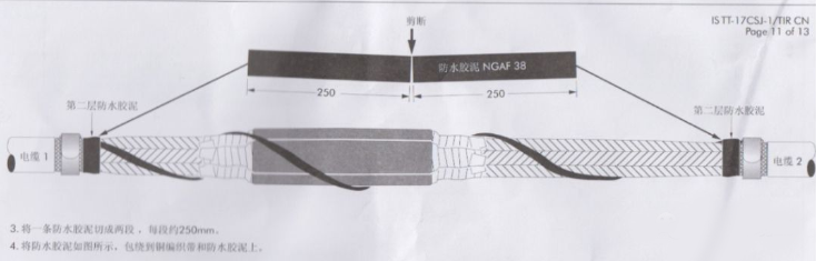 正确工艺:从一段铠装端口开始讲防水带拉长至1.5倍,以半搭叠方式绕包至另一端铠装端口,防水带胶黏层应紧贴电缆内护套。