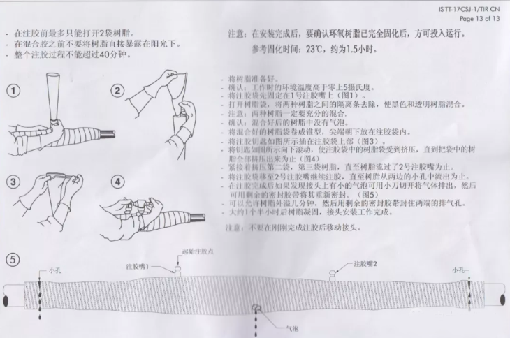 其他国外厂家注胶防水安装工艺图与上述N产品差别不大。A、Q产品不包含第二步,其灌注的树脂为单一树脂,不需要搅拌,直接灌注。