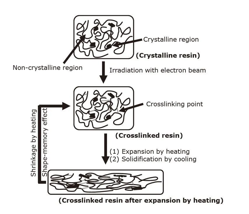 9797cc彩票 热收缩管在受热时收缩的原理如图3所示。当电子束传输到由结晶区和非结晶区组成的结晶树脂*4时,树脂分子在非晶区域相互连接。结果,树脂转变为具有在非晶区域中形成的交联点的交联树脂。通过加热使交联树脂膨胀,然后冷却并固化为热膨胀的交联树脂。当将热膨胀的交联树脂加热到等于或高于晶体区域的熔点的温度时,晶体熔化并变软。结果,由于存在交联点,树脂收缩成膨胀前的形状(形状记忆效应)。(1)